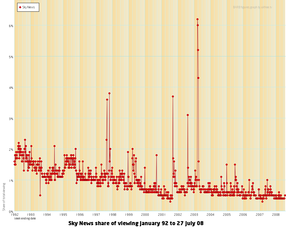 2005년 개편에는 지속적인 속보 뉴스 대신 "시청 약속" 프로그램 중심으로 설계된 새로운 편성표가 도입되었으나,[8] 2005년 10월부터 BBC 뉴스 채널이 시청률에서 스카이 뉴스를 앞지르면서 성공을 거두지 못했다.