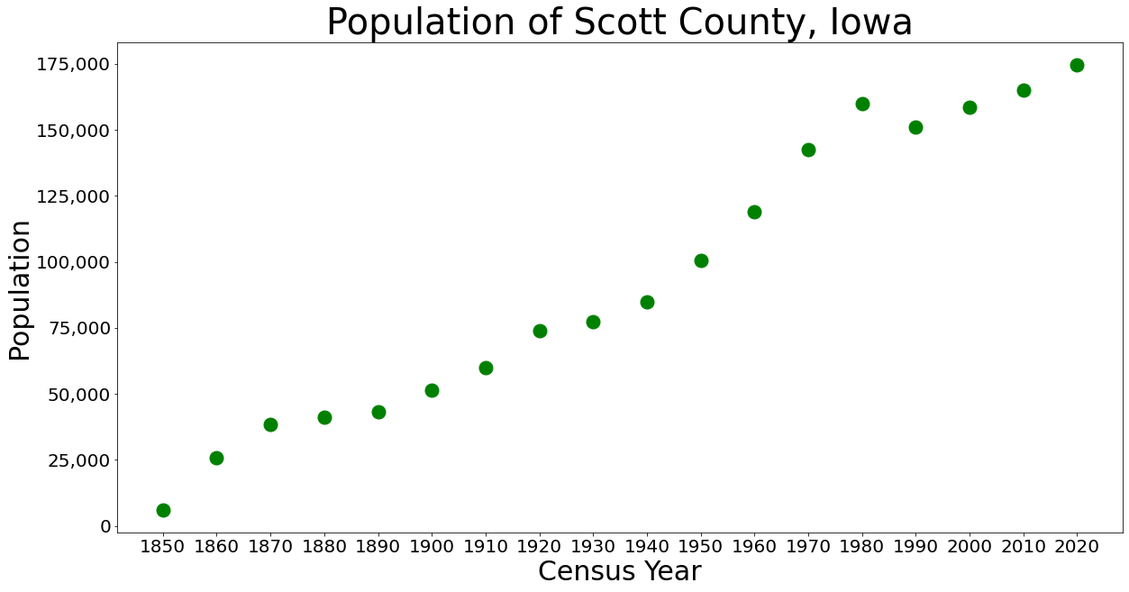 1900년까지 스콧군의 인구는 51,500명이었으며, 1950년까지는 100,000명을 넘어섰다. 현재 스콧군은 데번포트, 베텐도르프(아이오와주), 록 아일랜드, 몰린, 이스트 몰린 (일리노이주)을 포함하는 쿼드 시티 지역의 일부이다.