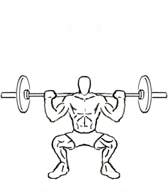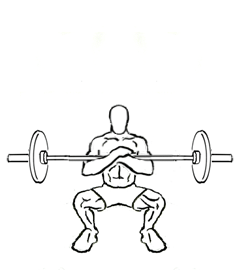 - '''프론트 스쿼트''' : 바벨을 쇄골과 삼각근 위, 몸 앞쪽에 위치시킨다. 클린 앤 저크 그립을 사용하거나 팔을 교차시켜 손을 바벨 위에 올린다. 승모근과 같은 상부 등 근육을 사용한다.[16]