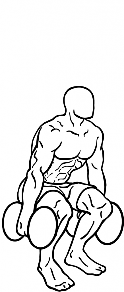 몸이 내려감에 따라 엉덩이와 무릎은 굴곡을 겪고, 발목은 펴지며(배굴) 관절 주변의 근육은 원심성으로 수축하여 동작의 바닥에서 최대 수축에 도달하면서 하강을 늦추고 반전시킨다. 엉덩이 주변의 근육은 바닥에서 힘을 제공한다. 다시 수직으로 돌아오면 근육이 구심성으로 수축하고, 엉덩이와 무릎은 신전을 겪는 동시에 발목은 저굴된다.[3]