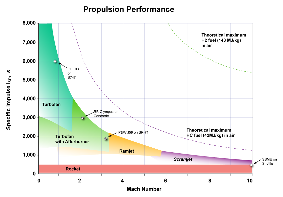 스크램제트는 흡입한 대기 중의 산소를 산화제로 사용하므로, 연료와 산화제를 모두 탑재해야 하는 로켓보다 비추력이 높아 효율이 우수하다.[56]