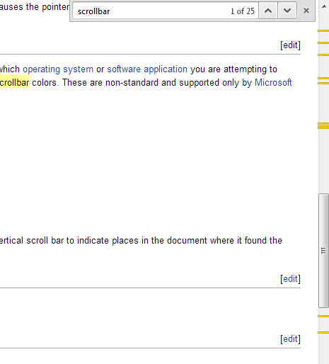 웹 페이지에서 스크롤바의 모양을 변경하는 일반적인 방법은 캐스케이딩 스타일 시트(CSS) 지시문을 사용하여 스크롤바 색상을 변경하는 것이다. 이는 비표준이며 마이크로소프트 인터넷 익스플로러 버전 5.x 이상 및 오페라에서만 지원된다.[23][24] WebKit 기반 브라우저에는 다음과 같은 가상 요소가 있다.