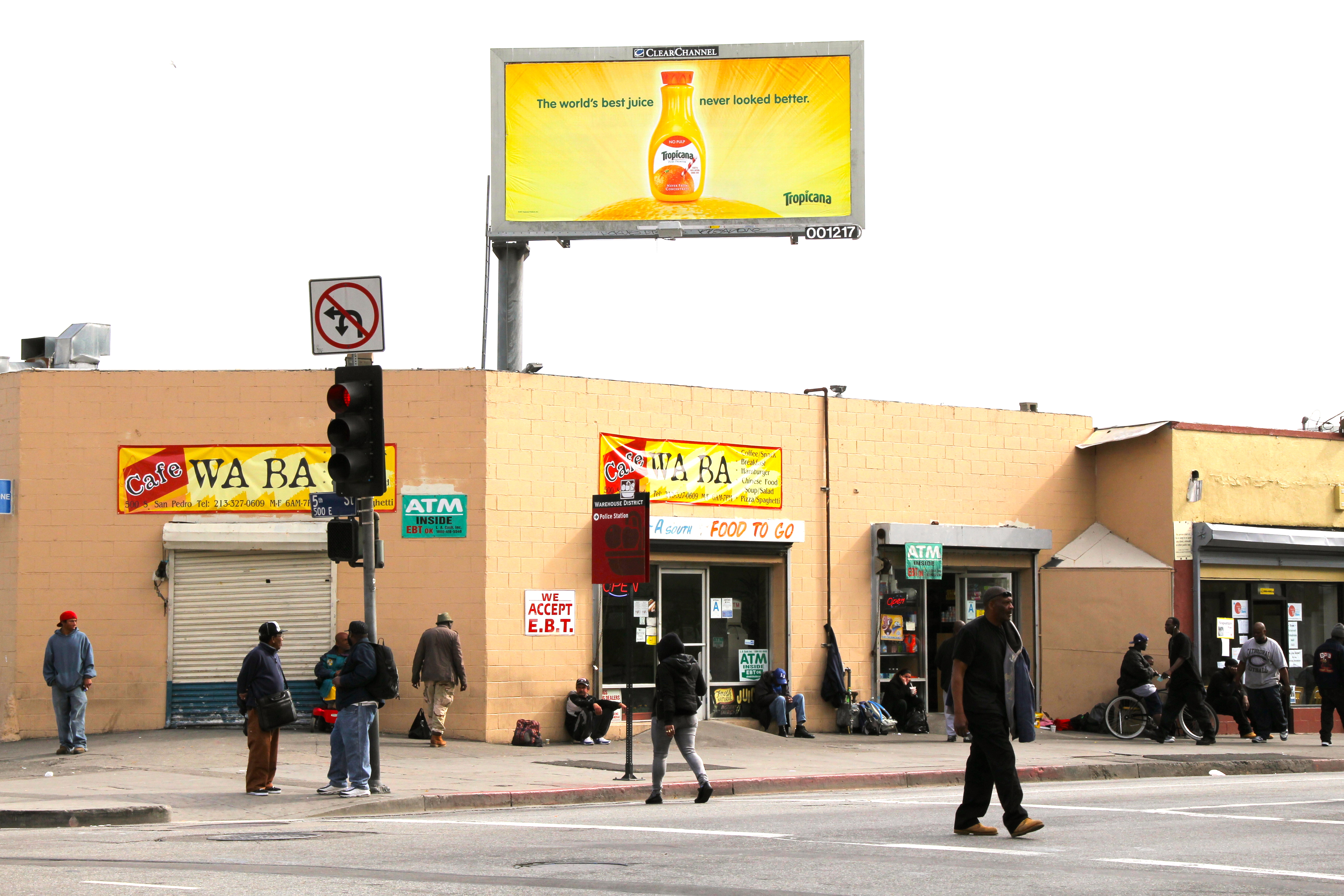 1987년 2월, 로스앤젤레스 경찰국 국장 대릴 게이츠는 당시 시장 톰 브래들리의 지원을 받아 스키드로에 있는 노숙자들에 대한 단속 계획을 발표했다.[23] 경찰과 소방관들이 이 지역을 여러 차례 휩쓸었지만, 노숙자 옹호자들의 반대로 인해 계획은 중단되었다.[23]