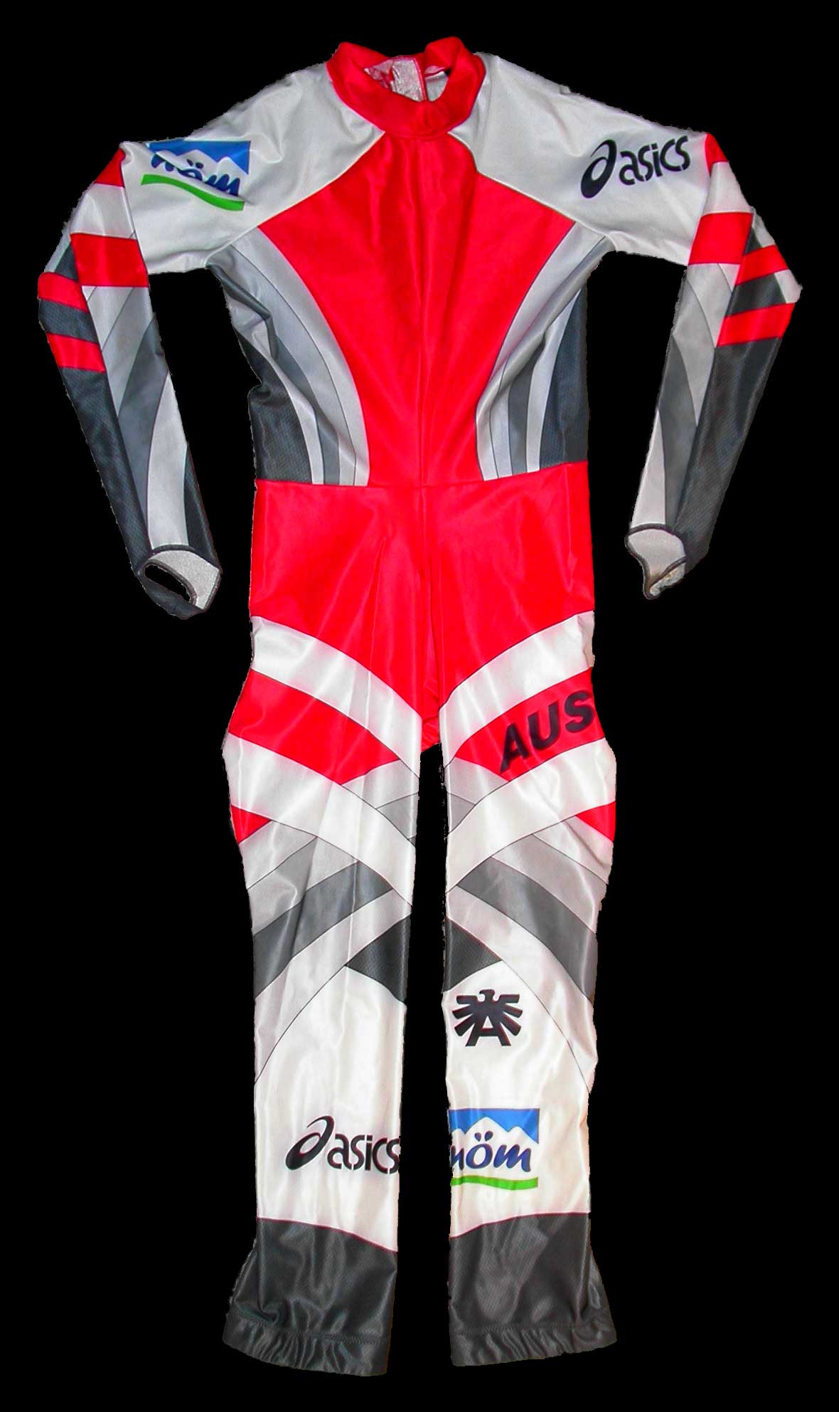 레이싱 시 착용하는 의류로, 공기 저항을 줄이기 위해 폴리우레탄 혼방 등 얇고 신축성 있는 원단을 사용하여 몸에 밀착되도록 제작된다. 표면은 캘린더 처리 등의 방법으로 높은 평활성을 갖게 하거나, 공기의 흐름을 정돈하기 위한 패턴이 착용 시 드러나는 특수 가공이 이루어지는 경우도 있다. 텔레비전 중계 등 각종 미디어에 노출도가 높기 때문에 각 팀의 개성을 연출하기 위해 눈에 띄는 디자인의 프린트가 되어 있는 경우가 많으며, 선수의 스폰서 기업의 로고 등이 새겨지기도 한다. 일반적으로 상하 일체형의 원피스 형태이며, 레이싱 원피스라고도 불린다. 보온성은 스키가 이루어지는 환경에서 착용하기에는 전혀 부족하며, 출발 직전까지 방한용 스키웨어를 레이싱 수트 바깥쪽에 겹쳐 입는 것이 보통이다.[14] 슈퍼대회전, 대회전, 회전 경기용 수트에는 폴과의 충돌로부터 신체를 보호하는 프로텍터를 조합한 것도 있다.[15] 1970년대에는 표면에 비닐 코팅을 한 수트가 사용되었으나, 속도가 너무 나와 위험하고 땀이 내부에서 증발하지 않아 피부 장애의 원인이 될 수 있다는 이유로 국제스키연맹(FIS)에 의해 통기성[16]이 있는 소재를 사용해야 한다는 규칙이 제정되었다. 중요한 공식 대회의 활강, 슈퍼대회전, 대회전 경기에서는 사전에 FIS에 의한 통기성 등의 테스트를 거쳐, 프롬프라고 불리는 합격증을 부착한 수트여야 착용할 수 있다. 프롬프가 필요 없는 회전 경기에서는 투피스 타입의 레이싱 수트를 착용하는 경우도 있다.