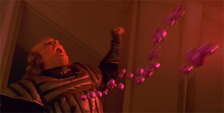 무중력 상태의 클링온이 벌크헤드로 던져져 보라색 피를 뿜어낸다. 실제로는 배우가 수평으로 떠 있는 환상을 주기 위해 세트를 90도 회전시켰고, 디지털 애니메이션 혈액 덩어리는 게시판에서 추가되었다.
