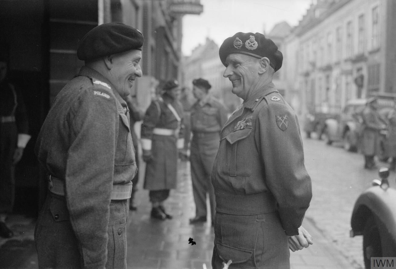1944년 11월 25일 브레다에서 영국 육군 원수 버나드 몽고메리 경이 제1 폴란드 기갑사단 본부를 방문하여 스타니스와프 마체크 소장과 대화하고 있다.