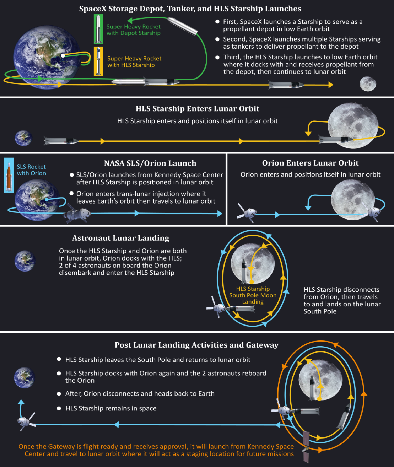 달 궤도에 도착한 스타십 HLS는 NASA의 오리온 우주선[17] 또는 루나 게이트웨이와 도킹하여 우주비행사를 태우고 달 표면에 착륙한다. 달 표면 임무 완료 후, 스타십 HLS는 달에서 이륙하여 다시 달 궤도로 돌아와 오리온 우주선과 도킹, 우주비행사를 지구로 귀환시킨다.[17]