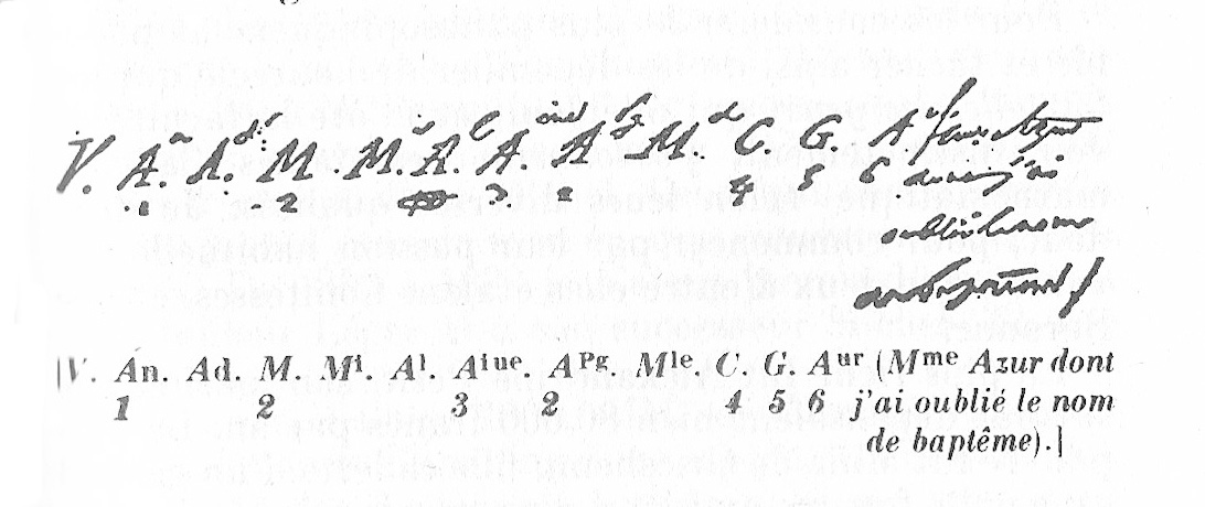 스탕달은 자신의 글과 서신에서 100개가 넘는 다양한 가명을 사용했다. "도미니크"와 "살비아티"는 친밀한 애칭으로 사용되었고, "코토네", "봄베", "샤미에"와 같이 자신을 부르주아적으로 보이게 하는 이름도 사용했다.[22] "돈 플레임", "조르조 바사리", "윌리엄 악어", "포베리노", "쿠텐드르 남작" 등 우스꽝스러운 이름을 사용하기도 했다. 그의 서신 교류자 중 한 명인 프로스페 메리메는 "그는 가짜 이름으로 서명하지 않고 편지를 쓴 적이 없다"라고 말했다.[23]
