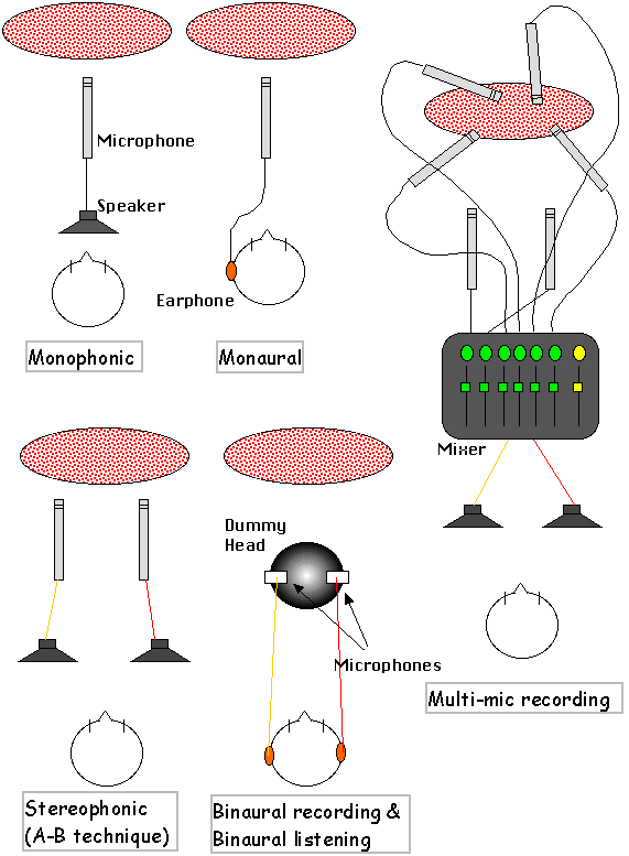- 바이노럴: 2개의 초소형 무지향성 마이크를 더미 헤드나 녹음자의 귀에 장착하여 헤드폰이나 이어폰으로 재생한다.