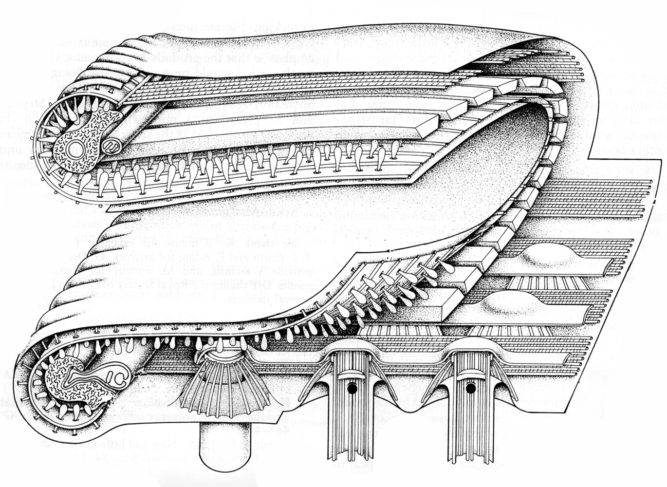 ''스테파노포곤 아포곤''의 구강 및 체세포 골격 요소의 선화. 왼쪽에 입의 개구부가 있고, 거기에서부터 긴 세포 골격 물질 스트립에 부착되어 있고 미세 소관의 원뿔에 의해 세포 표면에 고정된 편모의 선들이 뻗어 있다. 작은 낭 모양의 세포 소기관이 세포의 구강 부위와 관련되어 있다.