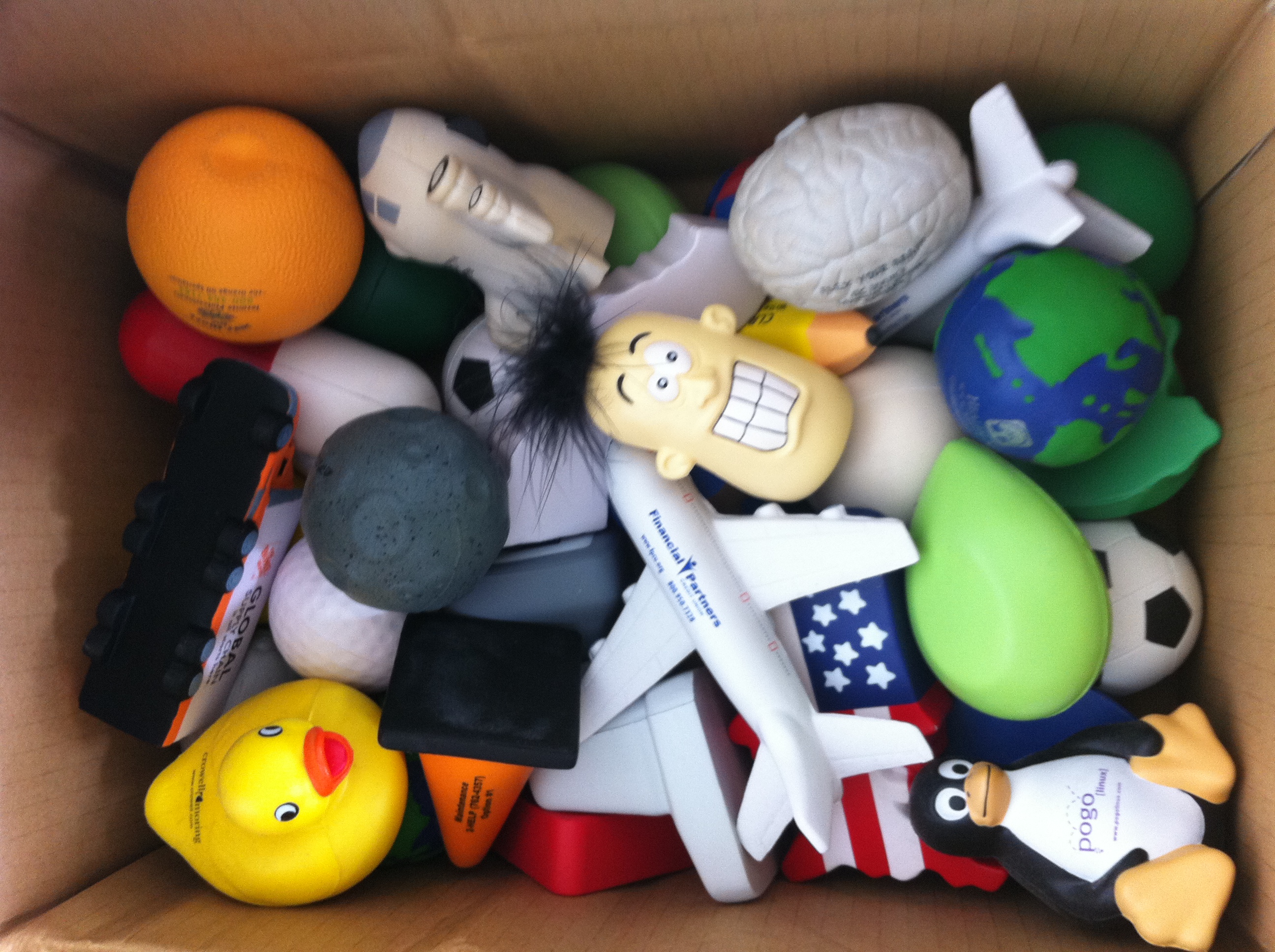 - 빈 백 (해키 색): 미국에서 가장 흔한 스트레스 볼 형태로, 작은 알갱이 등이 채워져 있다. 일반적으로 해키 색으로도 알려져 있다.[1]