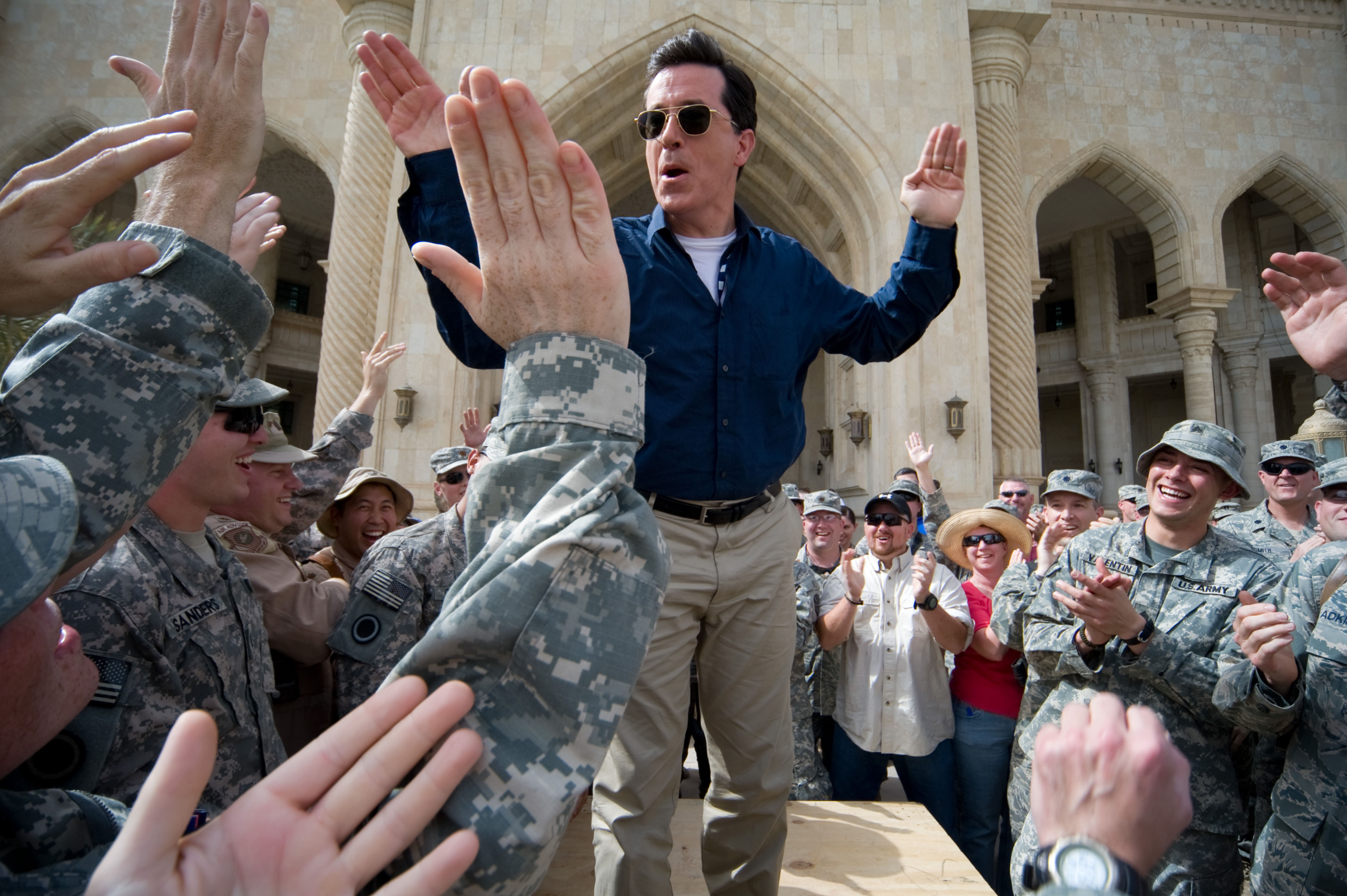 콜베어는 2009년 6월 5일, 미국 위문 협회(USO)가 후원하는 "이라크 작전 스티븐: 특공대 가다(Going Commando)"라는 제목의 쇼를 촬영하기 위해 이라크, 바그다드에 도착했다.[158] 그는 미 육군 전투복(Army Combat Uniform) 패턴으로 제작된 맞춤 정장을 입었다.[159] 첫 번째 에피소드에서 버락 오바마 대통령이 카메오로 출연했고, 콜베어는 군인들과의 연대감을 보여주기 위해 군인 스타일로 머리를 짧게 잘랐다. 한 육군 소령은 "머리를 자른 것은 매우 감동적인 훌륭한 지원"이라고 말했다. USO 선임 부사장 존 핸슨은 이 쇼가 군인들에게 중요한 기분 전환이 된다고 말했다.[160]