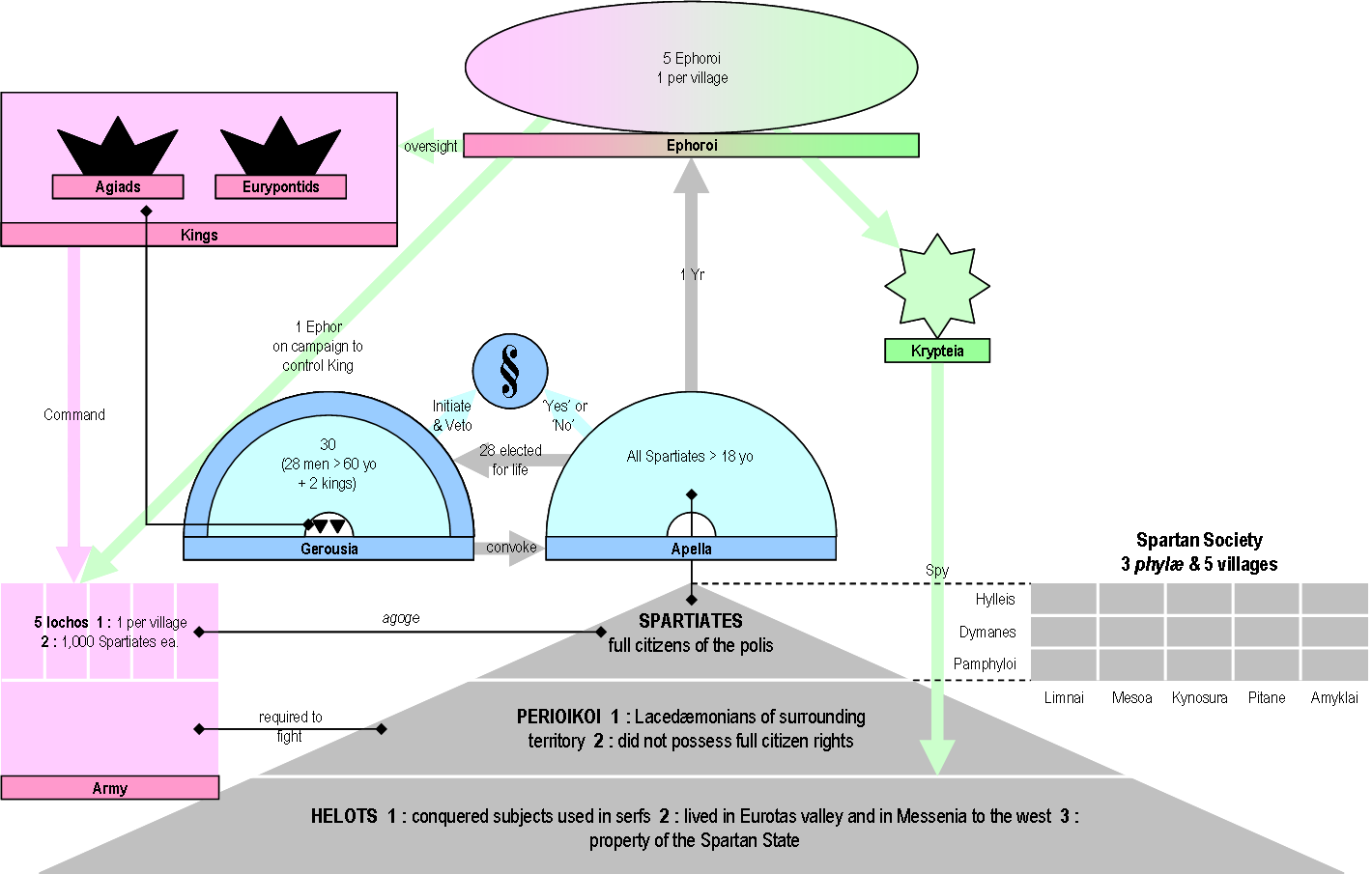 스파르타는 과두정치 국가였다. 국가는 아기아드 가문과 유뤼폰티드 가문 출신의 세습 왕 두 명이 다스렸고,[24] 왕의 임무는 주로 종교적, 사법적, 군사적이었다. 민사 및 형사 사건은 에포로이와 게로우시아 의회에서 결정했다. 스파르타 사회는 시민 외에 자유민인 페리오이코이와 국가 소유의 헬롯[68] 계급으로 구성되었다.헤일로타이와 페리오이코이에 대한 더 자세한 내용은 각 하위 섹션을 참고하면 된다.