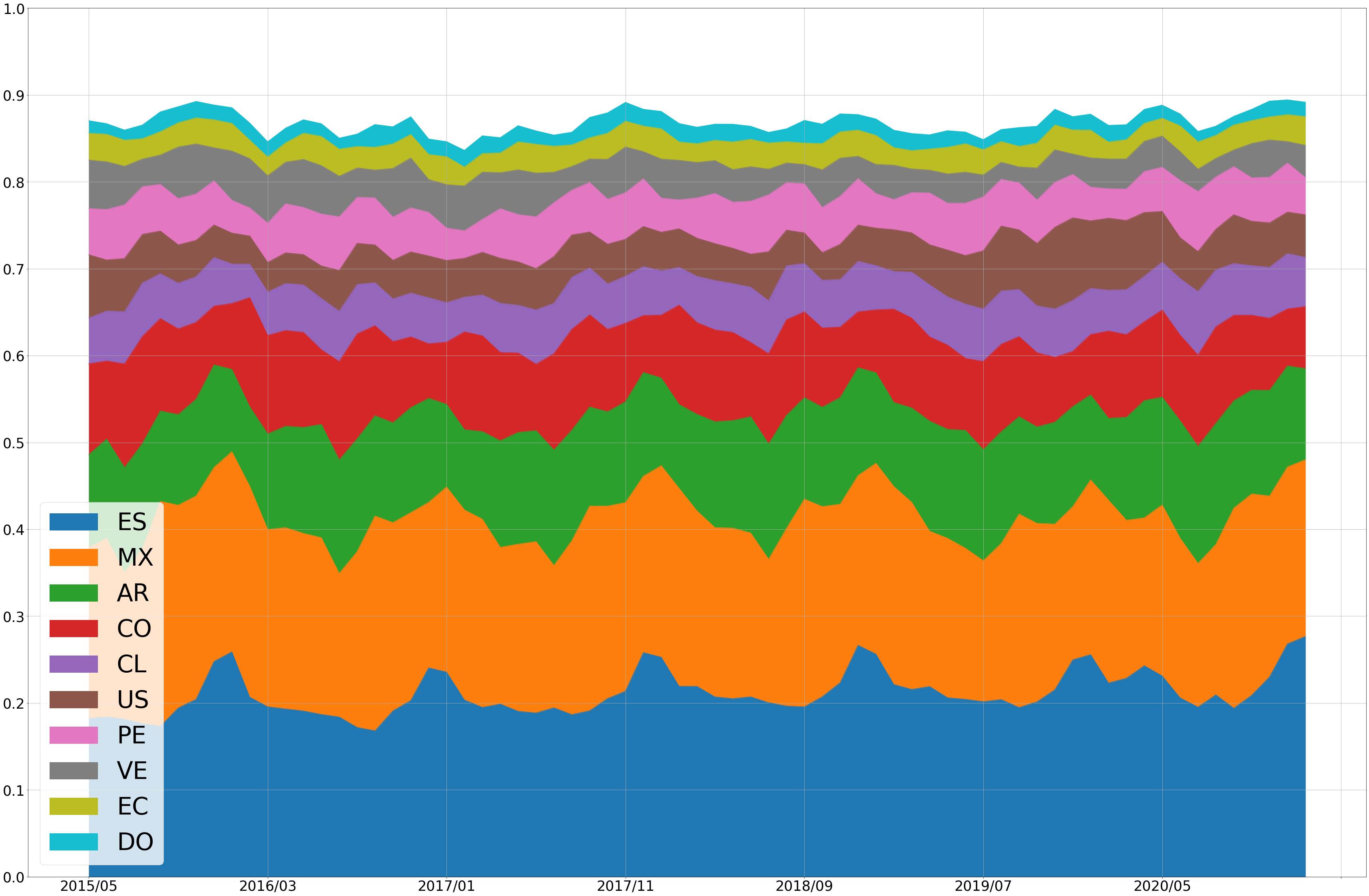스페인어 위키백과는 영어 위키백과 다음으로 두 번째로 많은 사용자를 보유하고 있으며, 활성 사용자 수는 영어, 프랑스어, 독일어 위키백과 다음으로 네 번째로 많다.[13] 2024년 5월 현재, 영어, 일본어, 러시아어, 독일어 위키백과에 이어 페이지 뷰 수에서 다섯 번째이다.[16]2021년 10월 기준 국가별 활성 편집자 비율은 다음과 같다.[45]