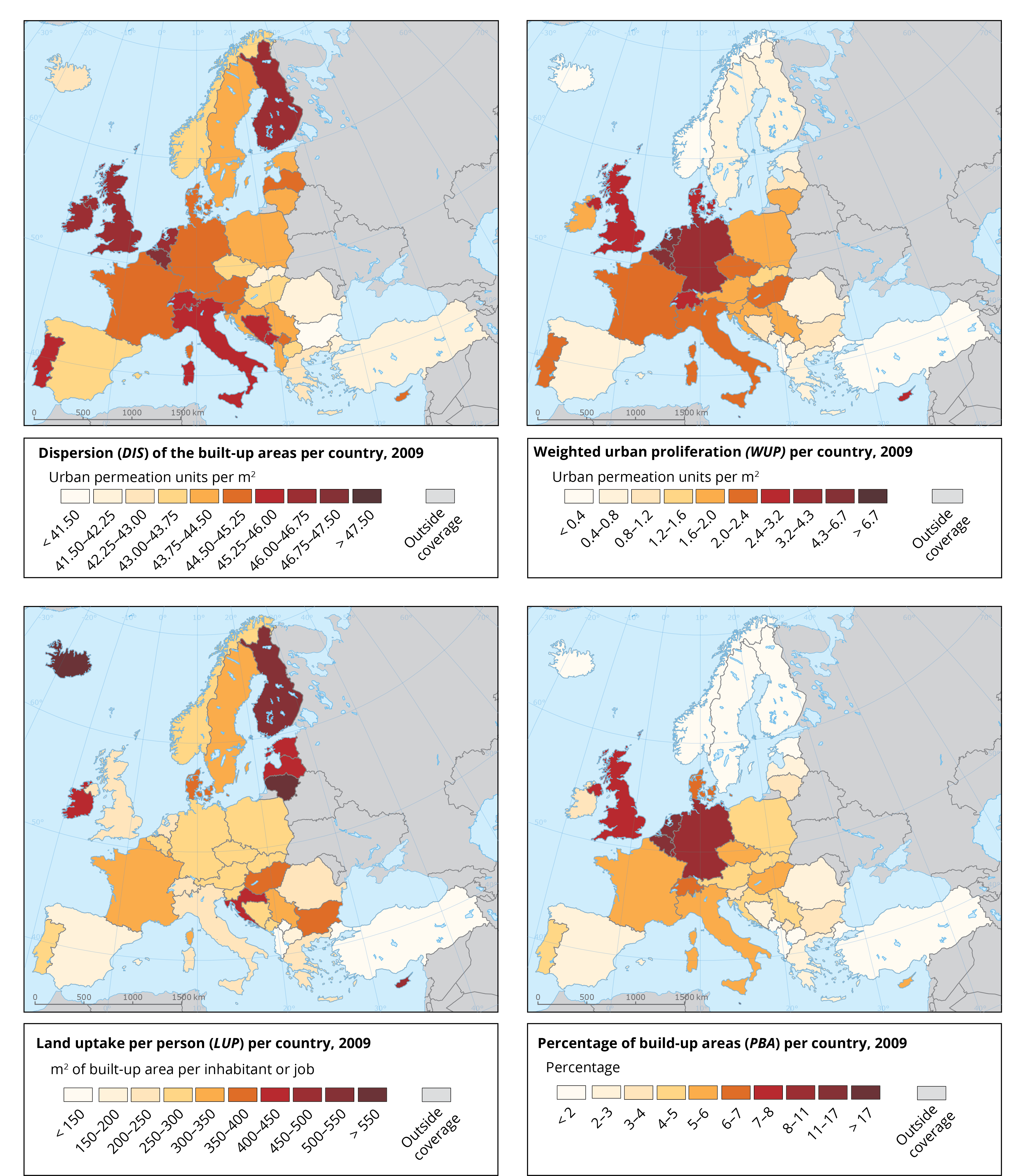 레이드 유잉은 스프롤 현상이 일반적으로 저밀도 또는 단일 용도 개발, 띠 모양 개발, 분산된 개발 및/또는 도약 개발 (빈 땅이 산재된 개발 지역) 중 하나 이상의 특징을 가진다고 말했다.[140] 그는 지표로 "접근성"과 "기능적 개방 공간"을 사용할 것을 제안했다.[139]