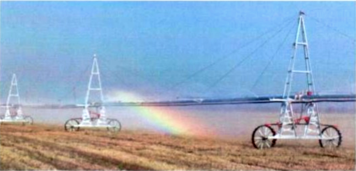 - 이동식 파이프 관개 시스템: 1950년대 오레곤주 포틀랜드의 Stout-Wyss 관개 시스템이 개발하여 널리 사용되었다. 스프링클러 헤드가 장착된 큰 파이프에 부착된 큰 바퀴가 들판을 천천히 이동하는 방식이다.[4]