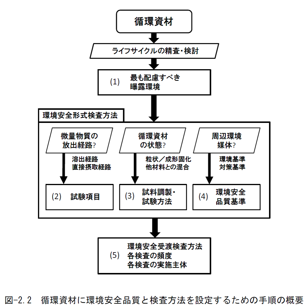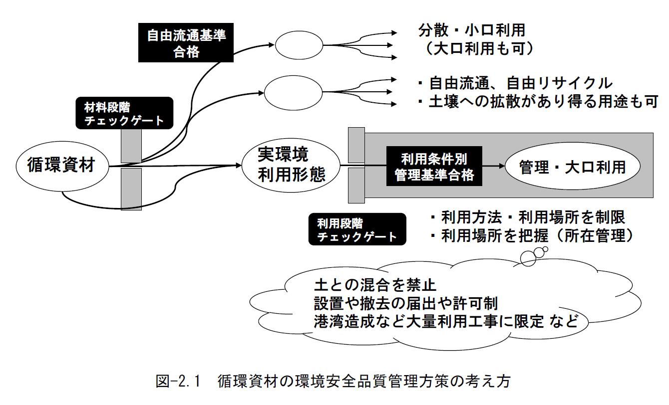 경제산업성 등에서 "슬래그류에 화학 물질 평가 방법을 도입하는 지침에 대해 - 종합 보고서 -"가 2012년 3월에 공개되었다. 여기에서는 순환 소재의 일례로 슬래그류가 거론됨과 동시에 순환 소재를 관리하기 위해 기존에 검토된 초안이 소개되었다[34]。