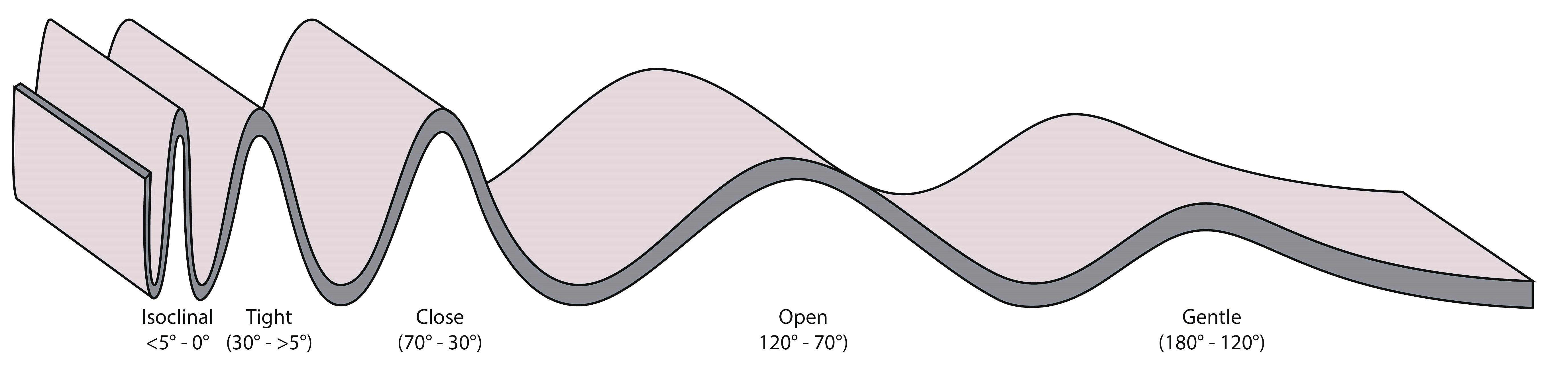 습곡의 밀집도는 습곡면 사이의 각도(각 습곡면의 변곡선에서 습곡된 표면에 접선으로 측정)로 정의되며, 이를 습곡면 사이 각도라고 한다. 완만한 습곡은 습곡면 사이 각도가 180°~120°이고, 열린 습곡은 120°~70°, 닫힌 습곡은 70°~30°, 조밀한 습곡은 30°~0°이다.[6] 등사선(isocline) 또는 등사습곡은 습곡면 사이 각도가 10°~0°이며, 습곡면이 거의 평행하다.