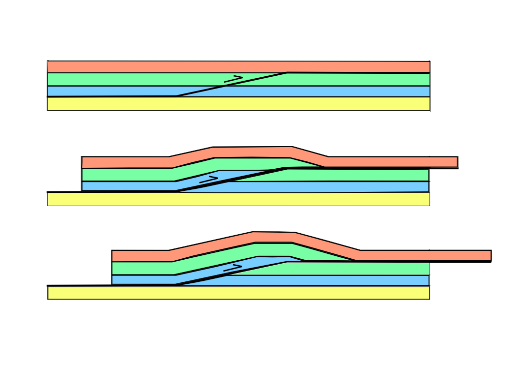 얇은 판 형태의 습곡은 얕은 곳에서 형성되며, 갈라진 틈에 의해 얇은 판이 된 암석이 빗나가서 생성된다. 이는 겹쳐 놓은 카드의 측면에 매직으로 주름을 그린 후 카드를 어긋나게 했을 때 나타나는 물결 모양과 유사하다.[27]