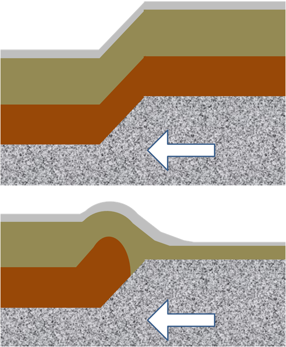 - 다짐: 습곡은 단층 블록이나 초와 같은 오래된 구조 위에서의 차별적 다짐에 의해 더 젊은 지층에서 생성될 수 있다.[18]