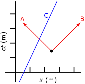 그림 2-1은 시공간 다이어그램을 이용하여 시공간 간격을 시각적으로 나타낸 예시이다. 두 광자 A와 B는 같은 사건에서 발생하여 반대 방향으로 진행하며, C는 빛보다 느린 속도로 움직이는 물체를 나타낸다. 광자의 세계선은 기울기가 ±1이다.[103]