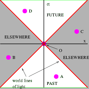 광추는 시공간을 그 꼭짓점에 대해 분리된 영역들로 나눈다. 미래 광추의 내부는 광속으로 ''공간적 거리''를 가로지르는 데 필요한 것보다 더 많은 ''시간''(시간적 거리)만큼 정점에서 분리된 모든 사건들로 구성된다. 이 사건들은 사건 O의 ''시간꼴 미래''를 구성한다. 마찬가지로 ''시간꼴 과거''는 과거 광추의 내부 사건을 포함한다. 광추의 외부 영역은 주어진 ''시간''에 광속으로 건너갈 수 있는 것보다 더 많은 ''공간''만큼 사건 O에서 분리된 사건으로 구성된다. 이러한 사건들은 사건 O의 소위 ''공간꼴'' 영역으로 구성된다. 광추 자체의 사건은 O에서 ''빛꼴''(또는 ''널 분리된'')이라고 말한다. 시공간 간격의 불변성 때문에, 모든 관찰자들은 주어진 사건에 동일한 광추를 할당할 것이고, 또한 따라서 이러한 시공간의 분할에 동의할 것이다.[93][107]