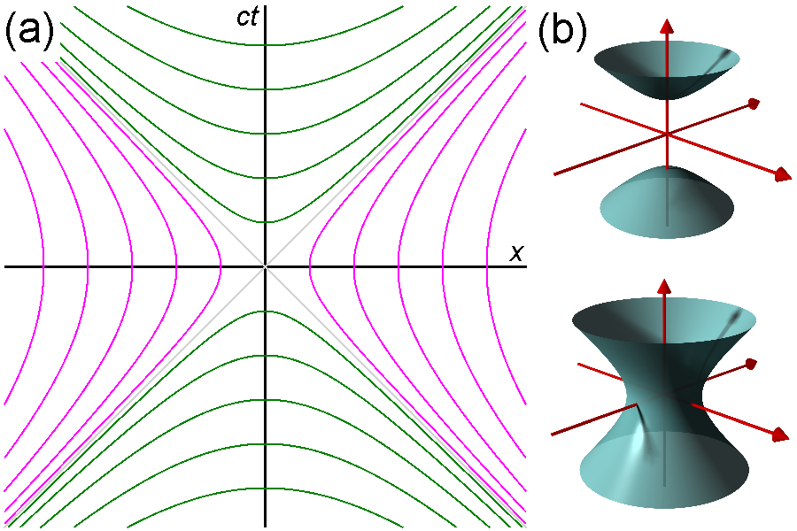 그림 2-7b는 (1+2)차원적 민코프스키 시공간(1개의 시간적 차원과 2개의 공간적 차원)에서 해당 쌍곡면들의 상황을 반영한다. 원점으로부터 공간꼴 간격들에 의한 변위된 불변 쌍곡선들은 한 장의 쌍곡면을 생성하고, 반면에 원점으로부터 시간꼴 간격만큼 변위된 불변 쌍곡선들은 두 장의 쌍곡면을 생성한다.