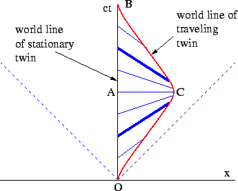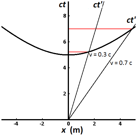 ''x''′축도 ''x''축에 대해 기울어져 있다. 이 기울기의 각도를 결정하기 위해, 빛 펄스의 세계선의 기울기가 항상 ±1임을 고려한다. 관찰자 O′의 관점에서 시공간도를 보면, 사건 P는 ''x''′ = 0, ''ct''′ = -''a''에서 한 광 펄스의 방출을 나타낸다. 펄스는 광원에서 거리 ''a''에 위치한 거울에서 반사되고(사건 Q), ''x''′ = 0, ''ct''′ = ''a''(사건 R)에서 광원으로 돌아간다.