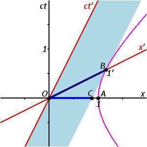 동일한 사건들 P, Q, R은 관찰자 O의 프레임에서 보면, 빛 경로들은 기울기 = 1 및 -1을 가지므로, △PQR은 45도에서 PQ 및 QR이 모두 x축 및 ct축에 대해 45도인 직각 삼각형을 형성한다. OP = OQ = OR이므로, ''x''′와 ''x''사이의 각도는 ''θ''이여야만 한다.