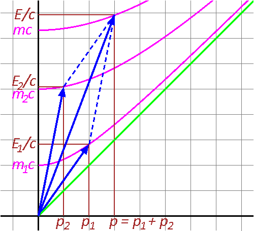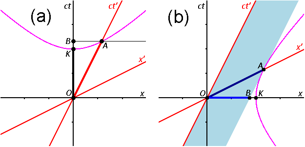 ''x''축을 가로지르는 자홍색 쌍곡선은 시간꼴 곡선들이고, 이러한 쌍곡선들은 시공간의 (지속적으로 가속하는) 입자들이 통과할 수 있는 실제 경로들을 나타낸다. 하나의 쌍곡선에 있는 어떤 두 사건들 사이에는 인과관계가 가능한데, 이는 모든 할선들에 대한 기울기(필요한 속도를 나타냄)의 역수가 ''c''보다 작기 때문이다. 반면에, ''ct''축을 가로지르는 녹색 쌍곡선은 이 쌍곡선을 따라 있는 모든 간격이 공간꼴 간격이기 때문에 공간꼴 곡선이다. 이 쌍곡선들 중 하나에 있는 두 점들 사이에는 아무런 인과관계가 가능하지 않다, 왜냐하면 모든 할선들이 ''c''보다 큰 속도들을 나타내기 때문이다.