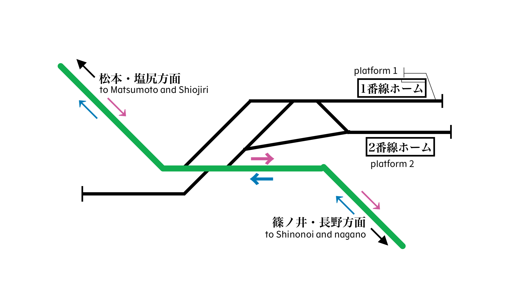 - 복선 구간: 아카시나~다자와, 마쓰모토~시오지리 (단, 니시조~아카시나 구간은 노반 자체는 복선이지만, 현재는 단선으로 운행)[6]
