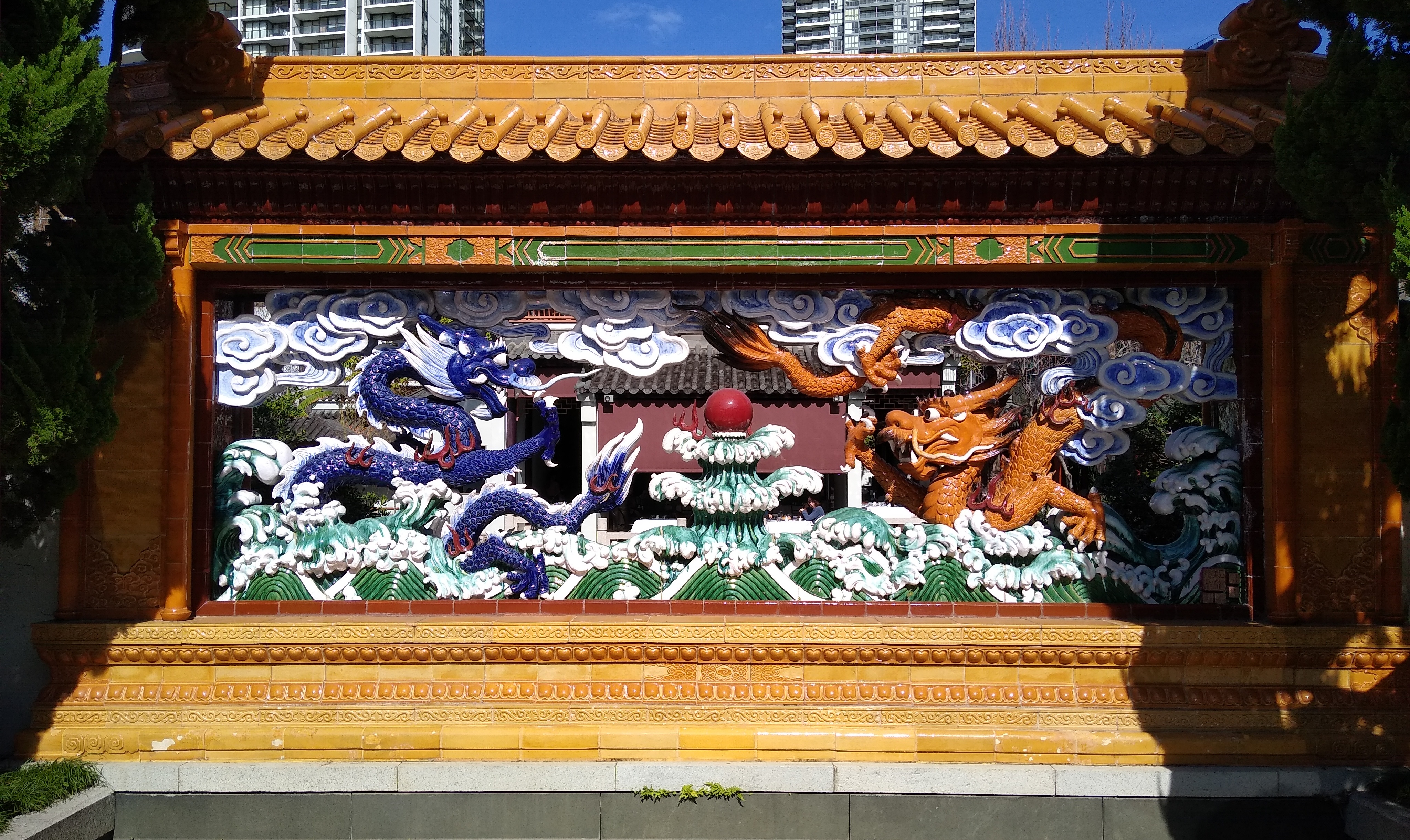 용의 벽(The Dragon Wall)은 이 정원을 위해 특별히 제작된, 중국에서 제작된 유약을 바른 테라코타로 만들어진 양면의 독립형 스크린이며, 광둥성 정부의 선물이다. 벽에는 뉴사우스웨일스주를 나타내는 파란 용과 광둥성을 나타내는 갈색 용이 묘사되어 있으며, 둘 다 지혜의 구슬을 찾고 있다. 벽 디자인은 산시성 다퉁시에 있는 "구룡 벽"을 기반으로 한다.[1]