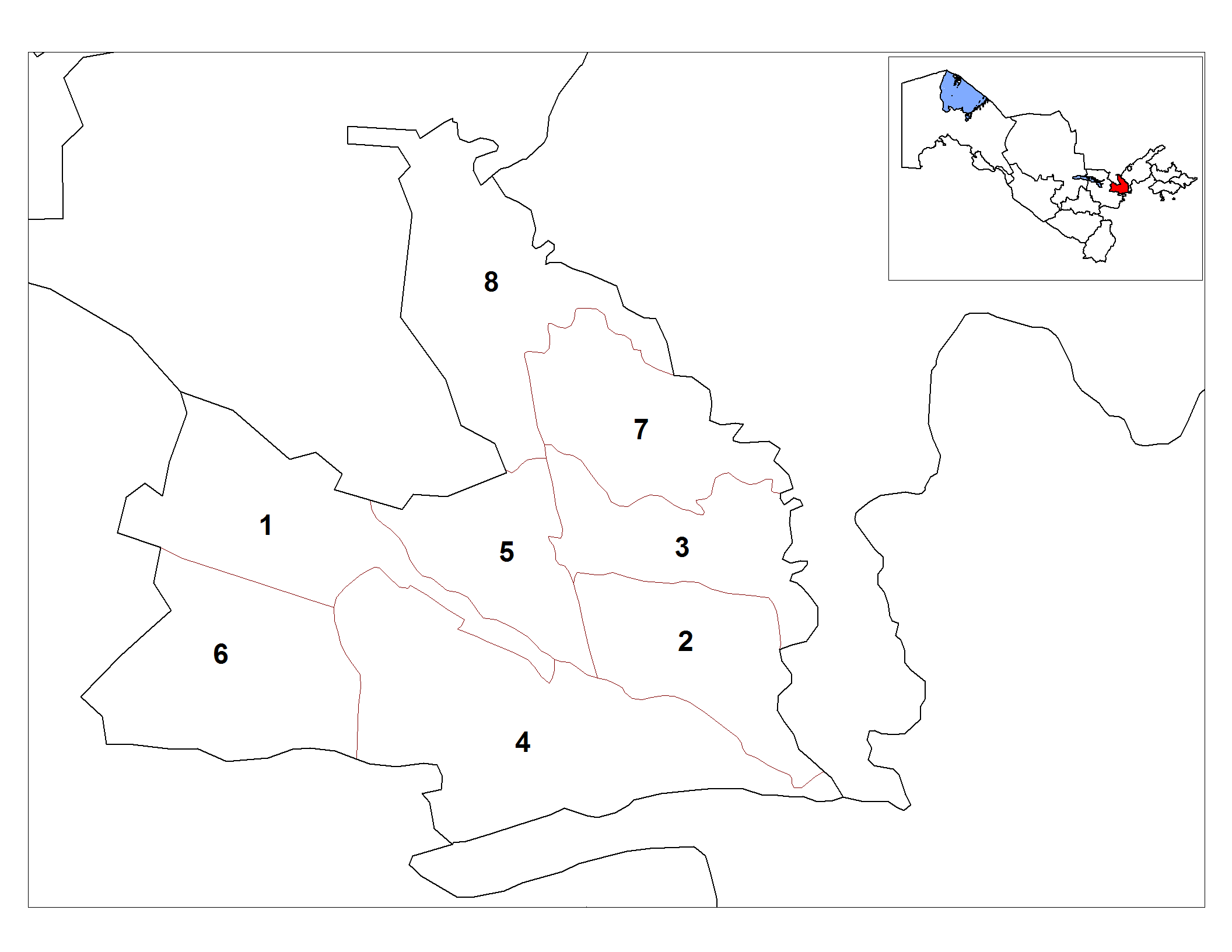 순서 | 구역명 | 구역명 (우즈베크어) | 구청 소재지 |