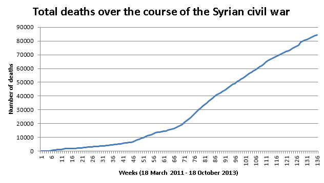 2013년 6월, 유엔은 사망자가 10만 명을 넘었다고 발표했다. 수만 명의 시위대가 투옥되었고, 교도소 내 고문과 테러가 광범위하게 자행되었다는 보고가 있었다.[1182] 국제 기구는 정부군과 반정부군 모두 심각한 인권 침해를 저질렀다고 경고했다.[1183] 시리아의 유엔 조사대는 시리아 정부의 인권 침해 규모가 가장 크다고 결론지었다.[1184][1185][1186] 시리아에서는 화학 무기 사용이 확인되어 국제적인 반응을 불러일으켰다.[1187] 2013년 8월 21일, 시리아 정부군은 다마스쿠스 인근 구타 지역에서 사린 가스 공격을 감행하여 1,300여 명이 사망했다.[1188]