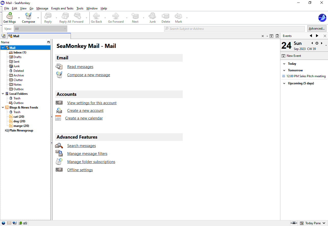 SeaMonkey 메일은 여러 계정 지원, 정크 메일 감지, 메시지 필터, HTML 메시지 지원, 주소록, 캘린더와 같은 기능을 포함하는 전통적인 이메일 클라이언트이다.[10] 썬더버드와 코드를 공유하며, 둘 다 모질라의 comm-central 소스 트리를 기반으로 구축되었다.[11]