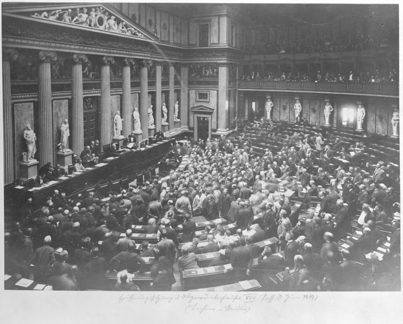 이 하원 (1873년에는 353명, 1907년에는 516명)에서는 처음에는 독일어 사용 대표가 지배했지만, 선거권이 확대되면서 슬라브족이 과반수를 차지했다. 특히 체코 민족 부흥의 맥락에서 독일어 사용 대표와 슬라브 대표 간의 민족 민족주의 투쟁이 벌어졌다. 프란티셰크 팔라츠키와 같은 운동 지도자들은 군주국 내 슬라브 인구의 해방을 옹호했고(오스트리아슬라브주의), 젊은 체코당의 정치인들은 ''Reichsrat''가 "체코 땅"과 관련된 결정을 내릴 권리를 부인하고 의사 방해와 불참을 사용하여 그들의 작업을 방해했다. 그들은 게오르크 폰 셰네러가 이끄는 급진적인 오스트리아 독일 민족주의에 의해 대립했다. 폰 셰네러는 군주국의 해체와 "독일 오스트리아" 땅과 독일 제국의 통일을 요구했다.