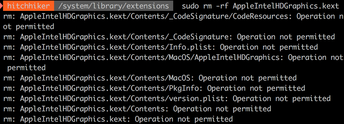 - 커널 확장 보호: OS X Yosemite부터 도입된 "kext 서명" 메커니즘을 통해, 서명되지 않은 커널 확장(kext) 로드를 차단한다.[4][11] 드라이버와 같은 커널 확장은 Apple에서 발급한 특정 개발자 ID로 코드 서명되어야 한다.[10][26] 서명되지 않은 확장이 발견되면 커널은 부팅을 거부하고 금지 기호를 표시한다.[4][11][27] macOS High Sierra부터는 여기에 더해, 서명된 커널 확장이라도 처음 로드될 때 사용자의 명시적인 허가를 요구하는 보안 커널 확장 로딩(Secure Kernel Extension Loading, SKEL) 기능이 추가되었다.[28]