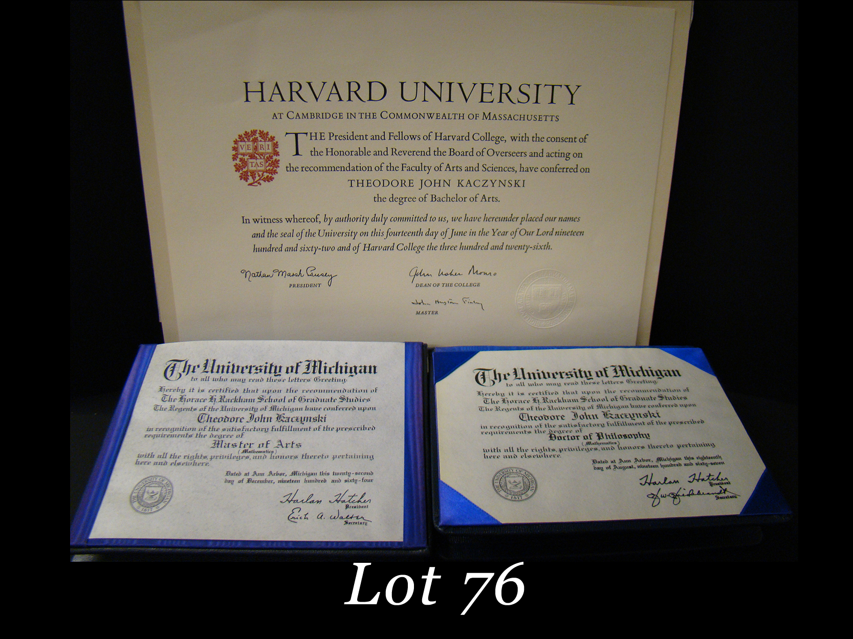 하버드 대학교 1학년 때, 카진스키는 가장 어리고 영재인 신입생들을 위한 공간인 8 프레스콧 스트리트에 거주했다. 이후 3년 동안은 엘리엇 하우스에 거주했다.[17] 그의 룸메이트들과 다른 하버드 학생들은 카진스키를 매우 똑똑하지만 사회적으로 내성적인 사람으로 묘사했다.[17] 1962년, 카진스키는 하버드에서 수학으로 학사 학위를 받았다.[18][19][20]