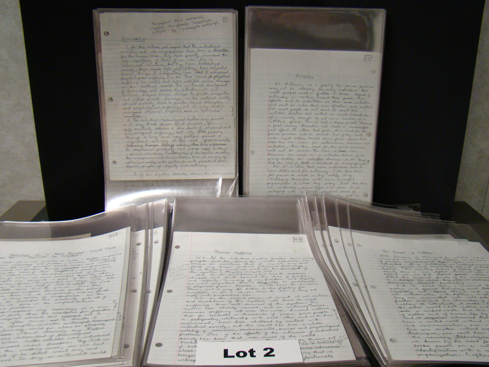 수감 중에도 카진스키는 여러 편의 에세이와 두 권의 책을 집필했다.[288] 미국 정부는 출판을 막으려 했지만, 법원은 언론의 자유를 우선시하여 인세 전액을 피해자 보상금으로 사용하도록 판결했다.[288] 그의 글은 미시간 대학교의 특별 소장 자료 중 가장 인기 있는 자료 중 하나이다.[91]
