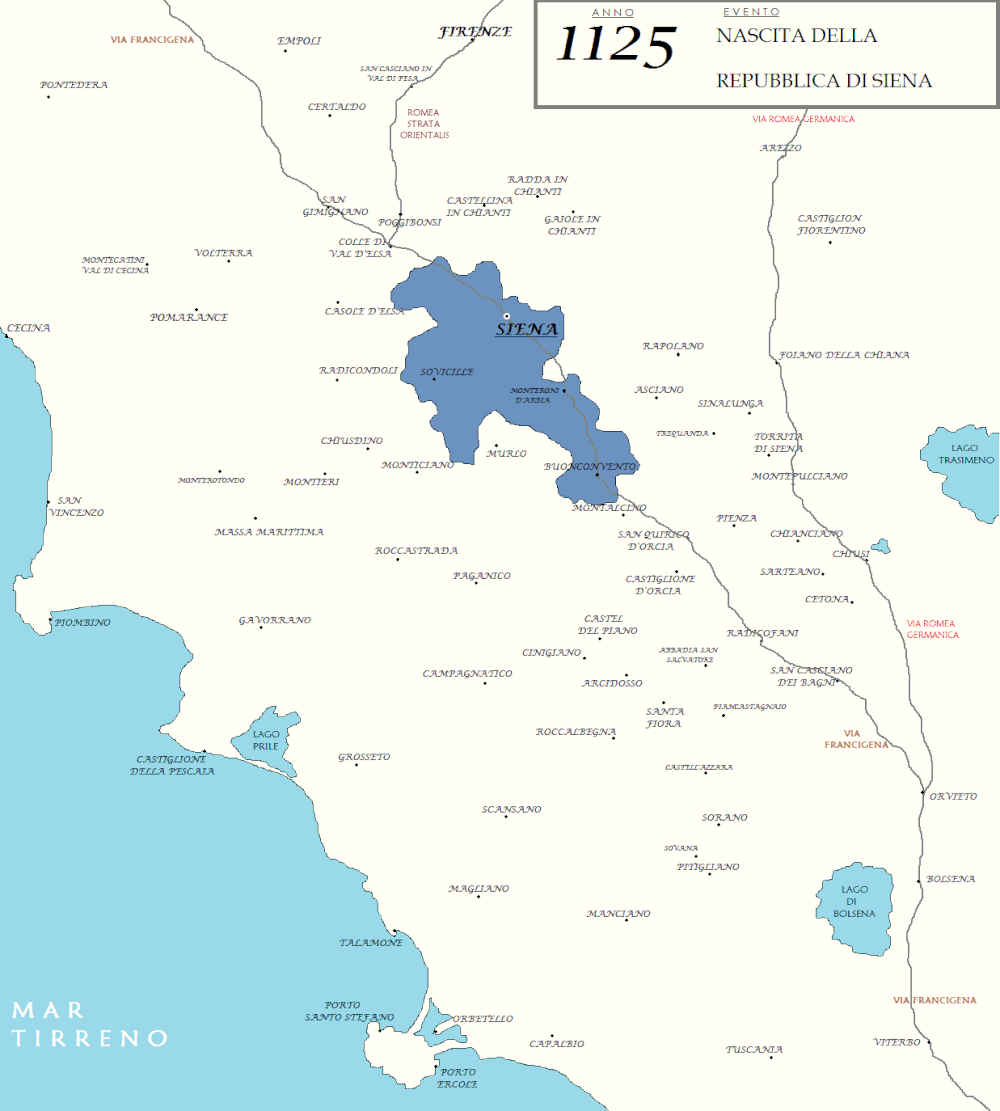 1115년, 북이탈리아의 대영주였던 토스카나 백작 부인마틸데 디 카노사가 후계자 없이 사망하자, 그 영토는 세분화되어 자치적인 세력이 흥기하고, 도시 국가들이 생겨나게 된다. 이 시대, 시에나 도시는 금융의 중심지가 되고, 또한 양모 거래의 중요한 플레이어로서 성장을 이룩했다.[2]