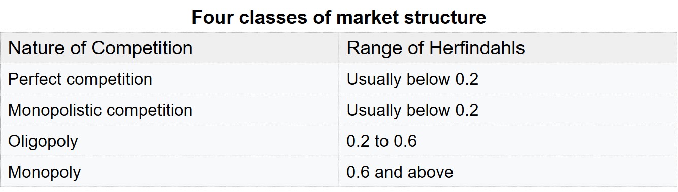 시장 구조를 측정하는 일반적인 지표는 N사 집중률(N사 집중률)과 허핀달 지수가 있다. N사 집중률은 시장 내 N개의 가장 큰 기업들의 결합된 시장 점유율을 나타낸다.[9] 허핀달 지수는 시장 내 모든 기업의 시장 점유율의 제곱의 합으로 정의되며, 이 지수의 증가는 경쟁 감소와 시장 지배력 증가를 의미한다.[17]