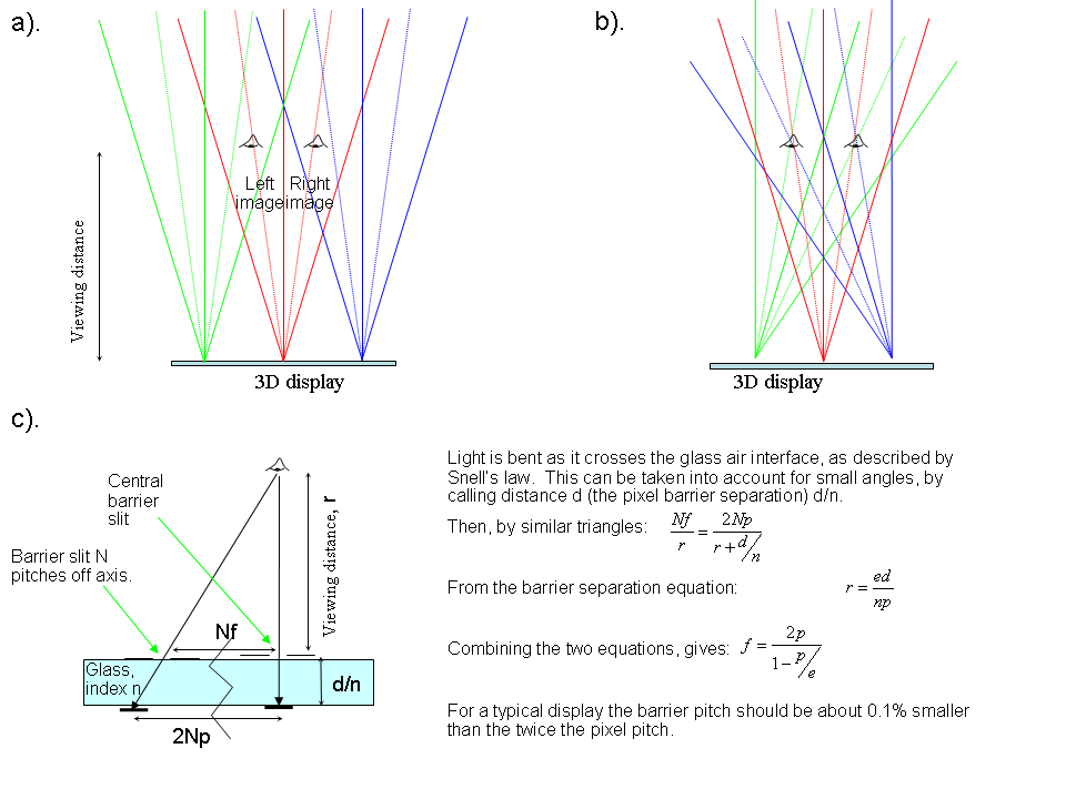 a). 시차 장벽의 피치가 픽셀 피치의 정확히 두 배인 경우, 전체 디스플레이에서 픽셀과 동기화되어 정렬된다. 왼쪽 및 오른쪽 보기는 디스플레이 전체에서 동일한 각도로 방출된다. 시청자의 왼쪽 눈이 화면의 모든 지점에서 왼쪽 이미지를 수신하지 못하는 것을 볼 수 있다. 디스플레이가 제대로 작동하지 않는다. b). 장벽 피치를 수정하면 보기가 수렴되어 시청자가 화면의 모든 지점에서 올바른 이미지를 볼 수 있다. c). 필요한 장벽의 피치를 결정하는 계산을 보여준다. p는 픽셀 피치이고, d는 픽셀 장벽 분리이며, f는 장벽 피치이다.