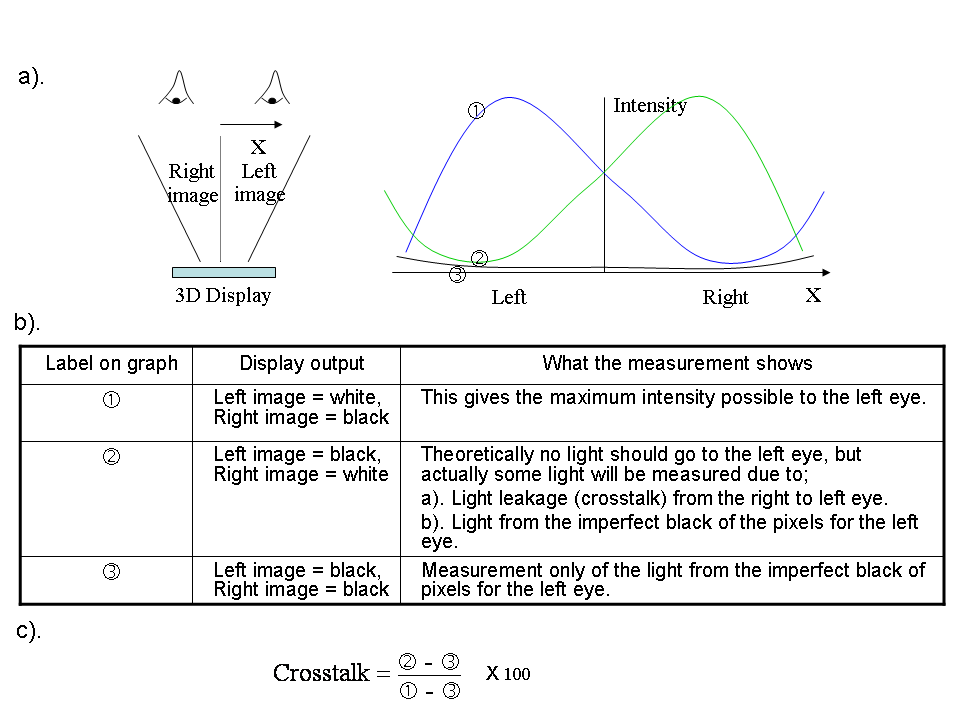 3D 디스플레이에서 상호 간섭 측정. 상호 간섭은 한 시점에서 다른 시점으로 새어 들어가는 빛의 비율이다.