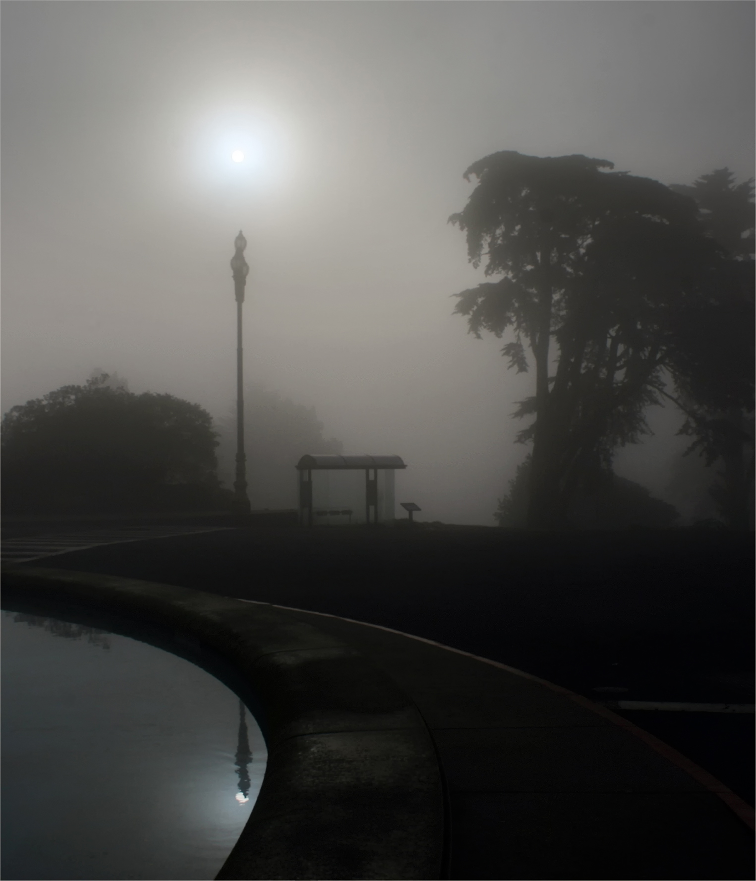 이 사진에서 태양가로등 꼭대기 위에 보입니다. 물에 비친 태양은 다른 시점에서 형성된 허상 때문에 가로등과 일직선상에 있는 것처럼 보입니다.