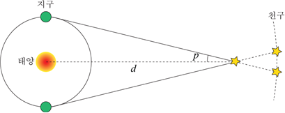 연주시차 공식 유도에 관한 그림이다. 태양부터 별까지의 거리를 d, 측정되는 시차를 p라고 정의한다.