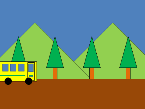 시차 스크롤링의 예시. 가장 가까운 버스, 그 뒤의 나무와 배경인 산이 서로 다른 속도로 움직인다. 버스와 나무의 상대속력이 버스와 산의 상대속력보다 크게 설계하여 원근감을 조성하는 효과를 낸다.