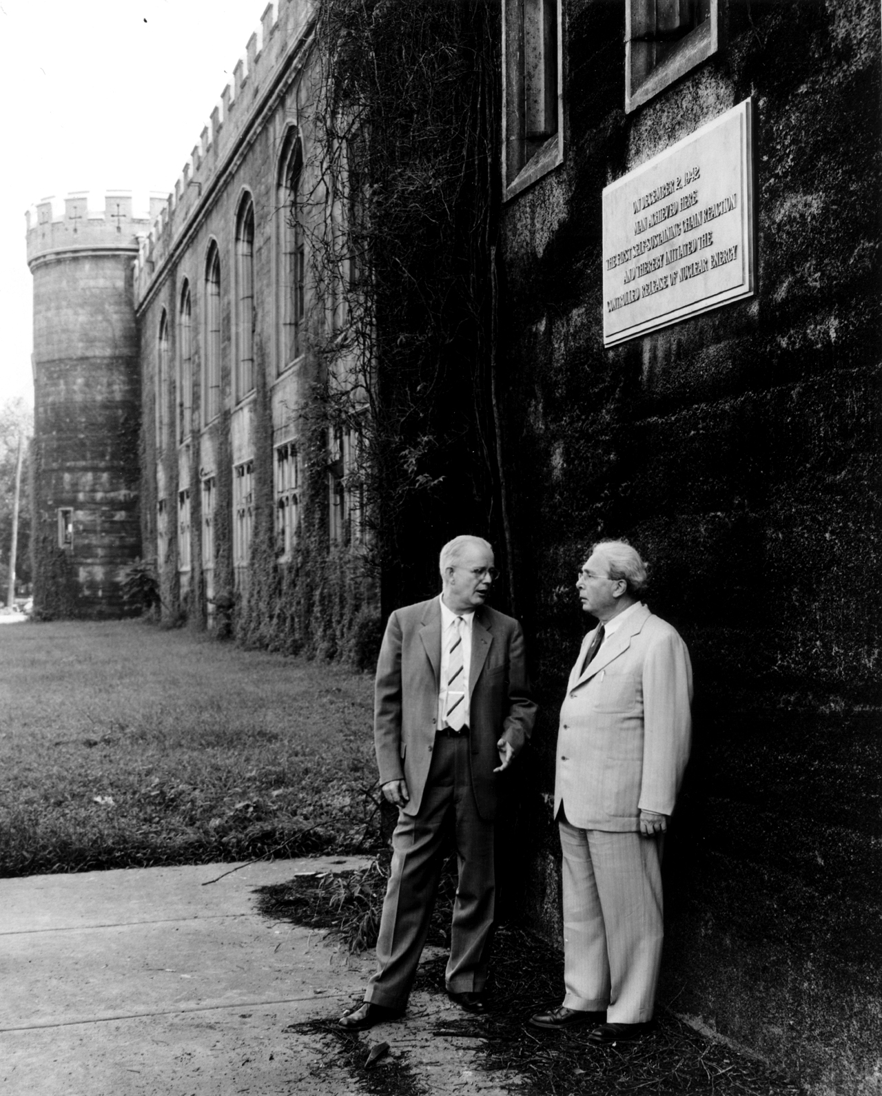 1942년 12월 2일, 시카고 파일 1호(CP-1)에서 최초의 자가 유지 핵 연쇄 반응 실험이 진행되었다. 엔리코 페르미(Enrico Fermi), 아서 H. 콤프턴(Arthur H. Compton), 허버트 L. 앤더슨(Herbert L. Anderson), 월터 진(Walter Zinn) 등은 발코니의 제어 장치 주변에 모였다.[27] 이 실험에는 해럴드 아그뉴(Harold Agnew), 레오 스질라드(Leo Szilard), 유진 위그너(Eugene Wigner) 등 49명의 과학자가 참석했다.[26]