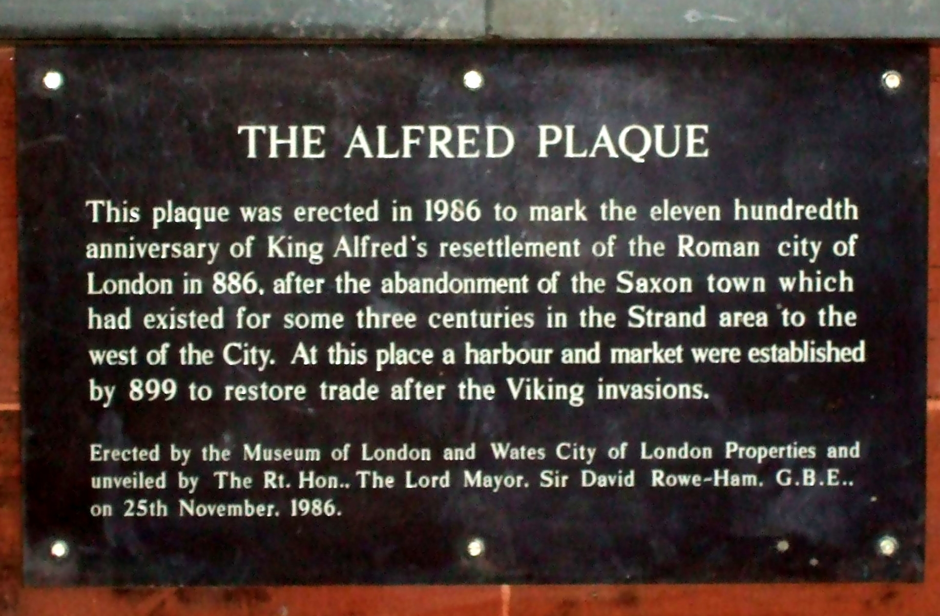 알프레드의 런던 점령과 옛 로마 도시의 재건은 런던 시의 영구적인 설립뿐만 아니라 웨섹스가 지배적인 잉글랜드 왕국이 되고 바이킹 점령과 약탈을 (어느 정도까지) 격퇴하는 등 초기 잉글랜드의 통일의 순간으로서 역사적 전환점이 되었다.[20] 런던과 잉글랜드는 그 이후 바이킹과 덴마크의 약탈과 점령에 다시 시달렸지만, 런던 시와 잉글랜드 왕국의 설립은 지속되었다.