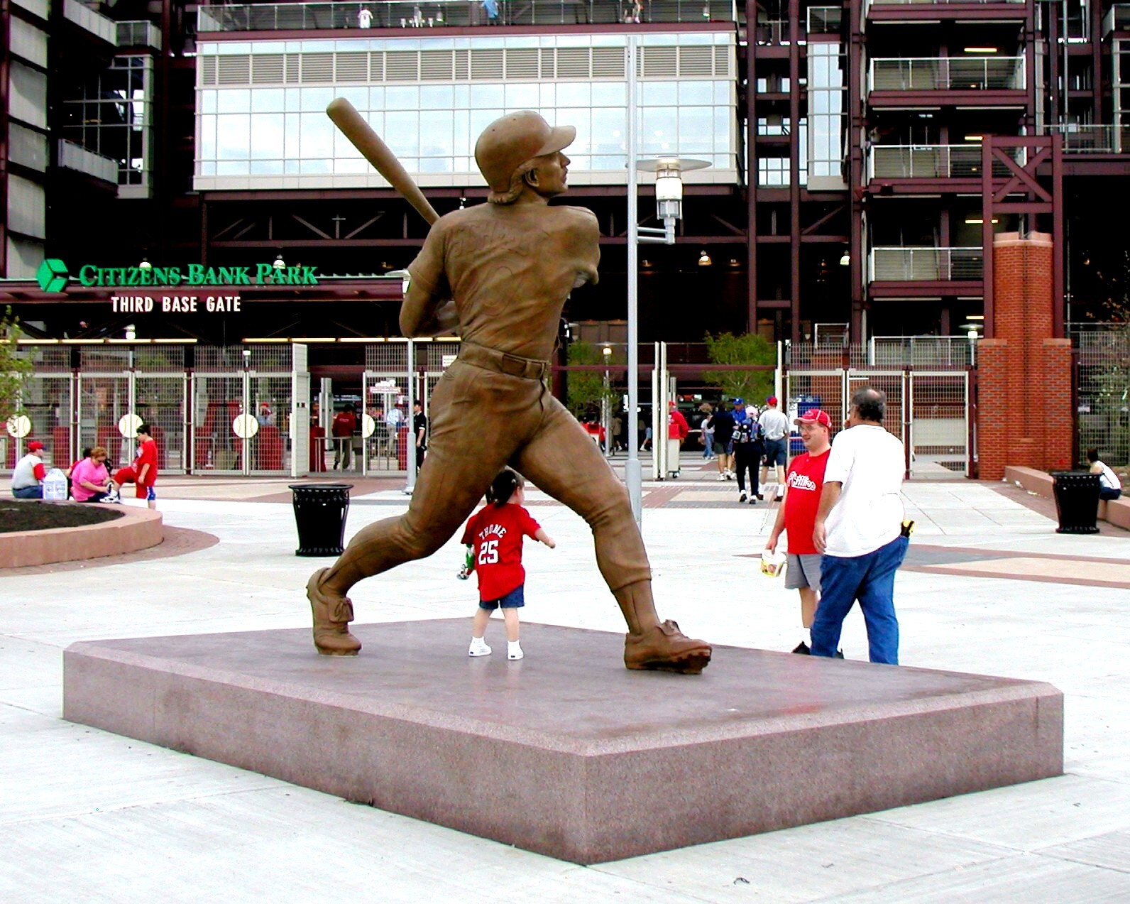 - '''동상:''' 애쉬번 앨리에 있는 리치 애쉬번 동상 외에도, 로빈 로버츠 (1루 관문), 마이크 슈미트 (3루 관문), 스티브 칼튼 (좌익수 관문) 등 세 명의 유명한 필리스 선수 동상이 시설 외부에 위치해 있다. 높이 약 3m의 이 동상들은 모두 지역 조각가 제노스 프루다키스가 제작하고 인근 체스터에 있는 라란 브론즈에서 주조했다.[34] 그 외에도 경기장 곳곳에는 필리스 역사에 이름을 남긴 유명 선수들의 이미지가 새겨진 타일 모자이크, 벽화, 테라조 바닥 등 다양한 예술 작품이 있다. 2011년 4월, 필리스는 팬들이 기금을 모아 제작한 전설적인 방송인 해리 칼라스의 높이 약 2.3m 청동 동상을 기증받았다. 저명한 지역 조각가 로렌스 노울란[35]이 제작하고 라란 브론즈[36]에서 주조한 이 동상은 2011년 8월 16일 애리조나 다이아몬드백스와의 경기 전에 헌정식을 거행한 후 141구역 뒤편, 칼라스의 이름을 딴 레스토랑 근처에 설치되었다. 필리스와 워싱턴 내셔널스 간의 경기가 우천으로 취소되는 바람에 동상 공개는 당초 예정보다 이틀 늦춰졌다 (원래 예정일은 동상 아래 바닥에 있는 명판에 기록되어 있다).[37][38]