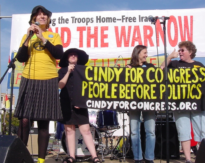 2006년 1월, 부시 대통령의 연두교서에 항의하는 티셔츠를 입고 국회에서 체포되었고,[47] 3월에는 뉴욕에서 이라크 여성들과 함께 전쟁 반대 시위 중 체포되었다.[48] 글로벌 익스체인지로부터 '국내 인권상'을 수상했다. 7월에는 단식 투쟁에 참여하고, MSNBC ''크리스 매튜스 하드볼''에서 부시 대통령을 비판했으며,[50] 텍사스주 크로퍼드에 토지를 구입했다.